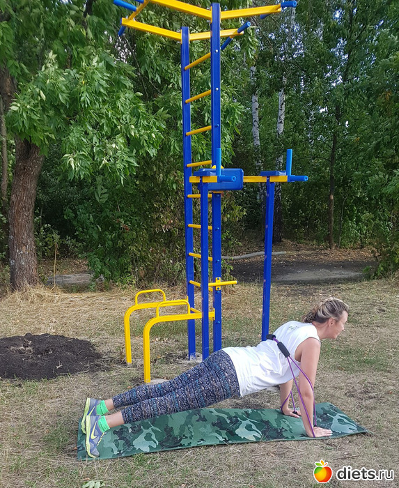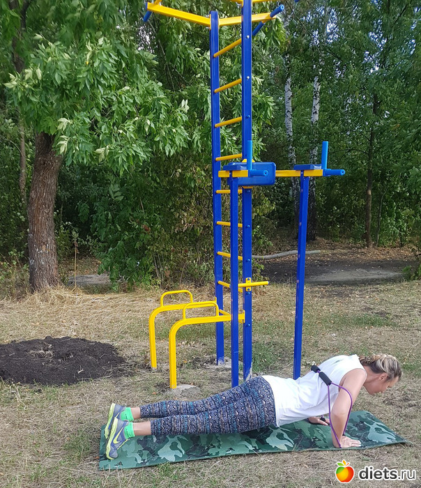 Встаньте в прямую планку, закинув эспандер на лопатки и держась за его края руками.