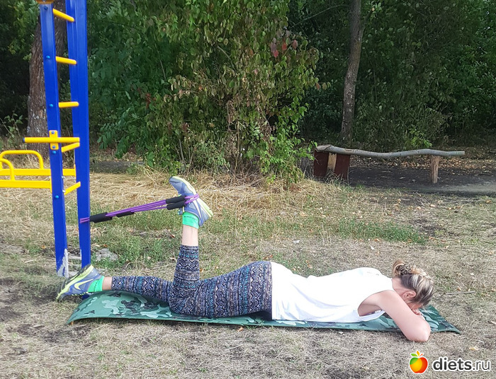 Центр эспандера закрепите внизу турника. Его края зафиксируйте на одной стопе. Ложитесь на живот. Сгибайте ногу с эспандером в колене, тянитесь стопой к ягодицам, растягивая эластичную веревку. Сделайте по 12-15 повторов упражнения с каждой ноги.
