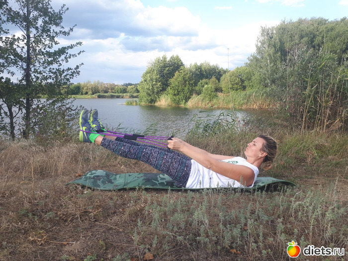 Сядьте на пол. Центр эспандера зафиксируйте на стопах, его края удерживайте в руках. Прямые ноги поднимите над полом, корпус немного отклоните назад.