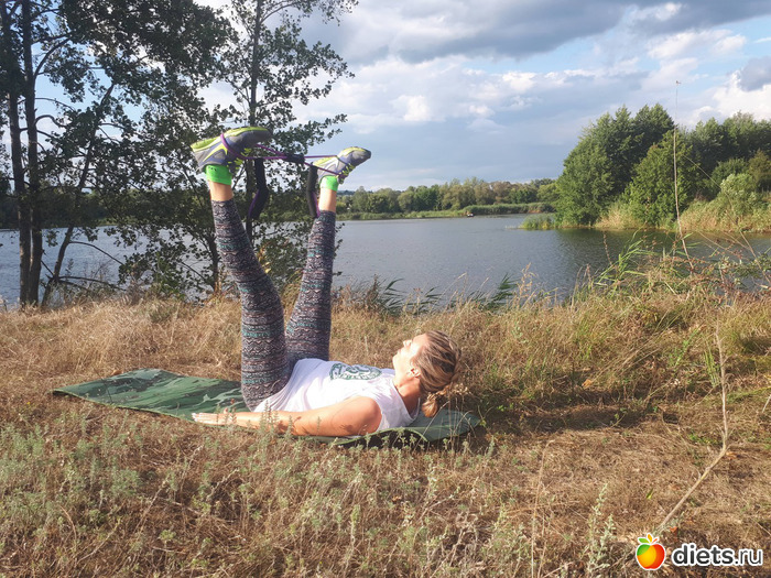 Сложите эспандер пополам и проденьте в получившиеся петли стопы. Прямые ноги поднимите до перпендикуляра с полом. Голову и плечи все так же удерживайте над полом.