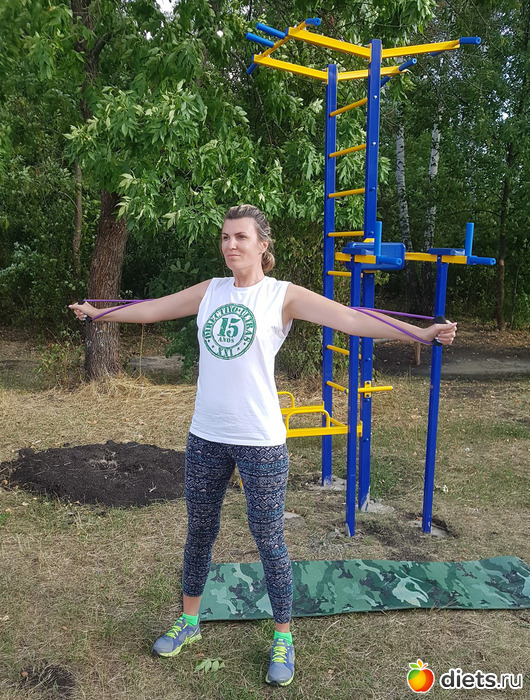 Встаньте прямо. Центр эспандера зафиксируйте на спине, за его края держитесь руками, разведенными в стороны.