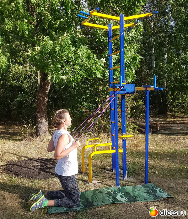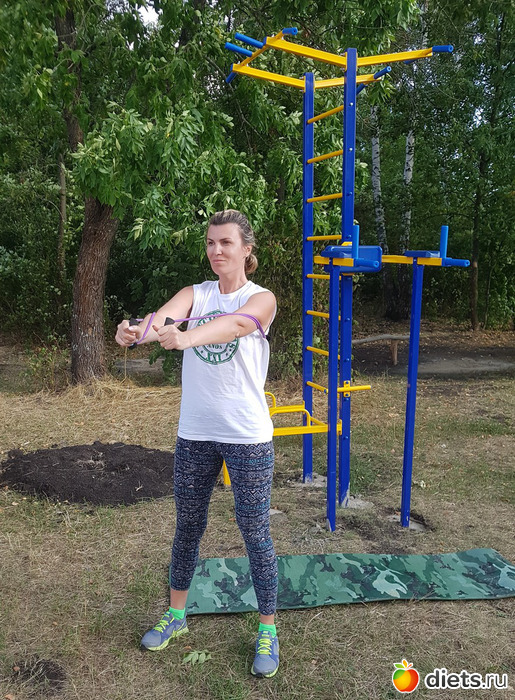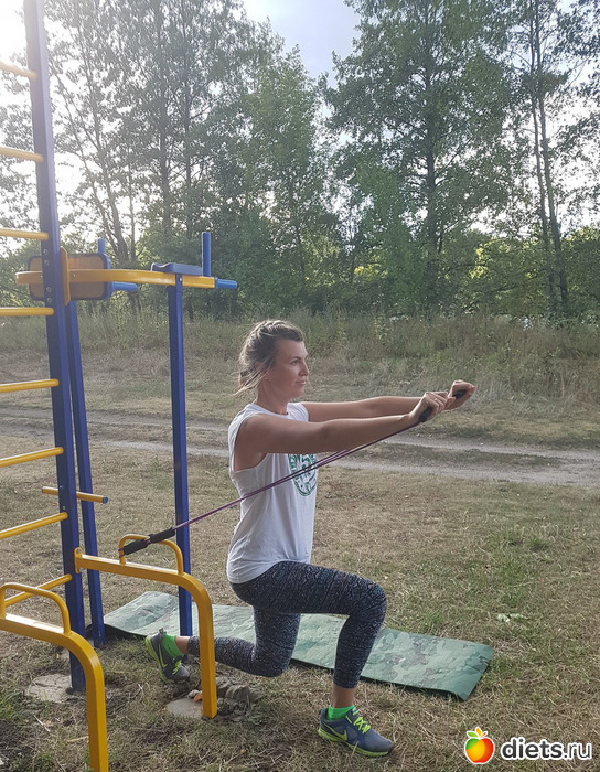 Данное упражнение можно выполнять в выпаде на одну ногу. Так, кроме работы верхней части тела, вы задействуйте еще и нижнюю. Центр эспандера зафиксируйте позади себя на уровне талии. За его края возьмитесь руками, согнутыми в локтях.