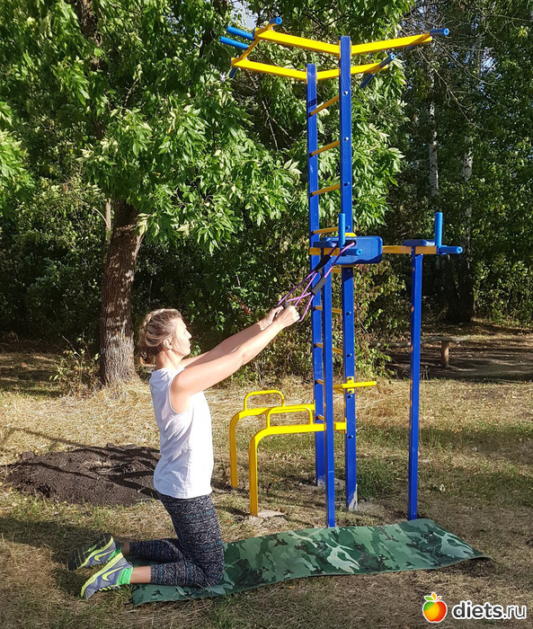 Закрепите центр трубчатого эспандера за турник или любую другую надежную конструкцию так, чтобы для удержания его краев нужно было поднять руки вверх (можно встать при этом на колени). Используйте неопреновые трубки в качестве ручек.