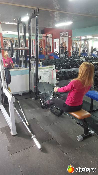 Также для спины можно сидя в специальном тренажере тянуть блок к бедрам. Как и в предыдущем упражнении, хватайтесь руками за рукоятку блока, сгибайте руки в локтях и подтягивайте ручку к бедрам, корпус при этом немного отклоняйте назад.