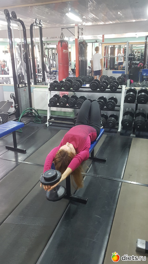 Теперь заводите утяжелитель такими же прямыми руками за голову. Почувствуйте, как тянется грудь.