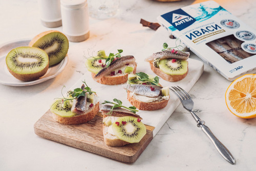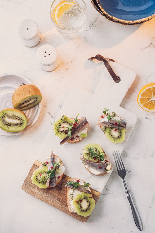 Самые необычные и приятно запоминающиеся сочетания сельди — всегда с немного кисловатыми ингредиентами. Традиционно ее очень любят употреблять с дольками яблока и лимончика в качестве закусок. Однако достойной парой для Иваси можно считать киви, который освежает и оттеняет яркий вкус этой жирной рыбки и, более того, выглядит гораздо привлекательнее при подаче, особенно с кресс-салатом, рукколой или лепестками другой зелени. Нужно взять всего лишь кусочек свежего ржаного хлеба, филе Иваси и положить сверху ломтик киви — закуска готова! (А с творожным сыром еще вкуснее!)