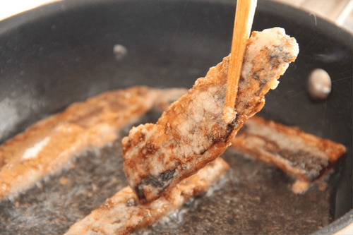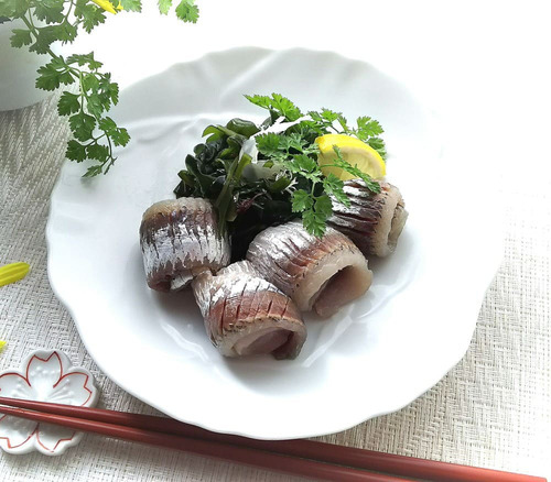 Иваси-но агэмоно, или жареные рулетики из иваси. Листочки сисо — альтернатива мяты, пару кубиков хрустящего сельдерея и слайс зеленого перца укладывают на филе иваси и заворачивают в рулетик, после чего обжаривают на уже подогретой маслянистой сковороде. Обжаренные с двух сторон рулетики подаются на стол с острым васаби, соевым соусом и рассыпчатым рисом в качестве закуски.