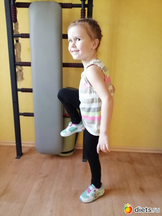 Предложите ребенку пошагать на месте или по комнате, высоко поднимая колено (до уровня параллели бедра с полом).