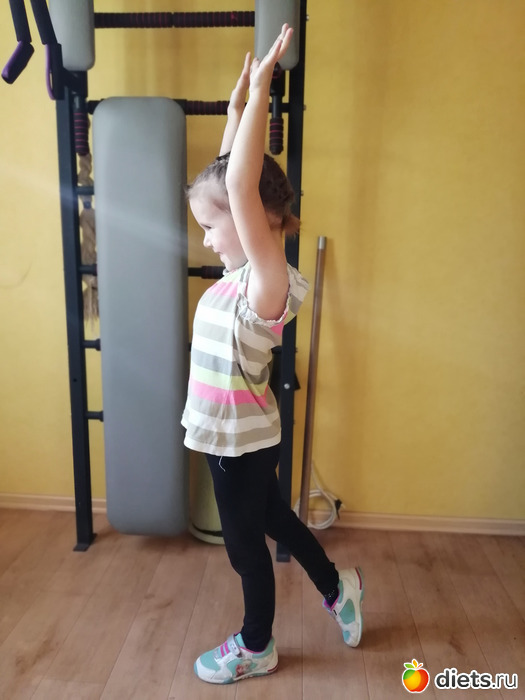 Пусть ребенок, стоя прямо, поднимет прямые руки вверх и одновременно отставит одну прямую ногу назад. После возвращения в исходное положение нужно повторить подъем рук вверх с одновременным отведением назад уже другой ноги. Повторите упражнение 3-6 раз.