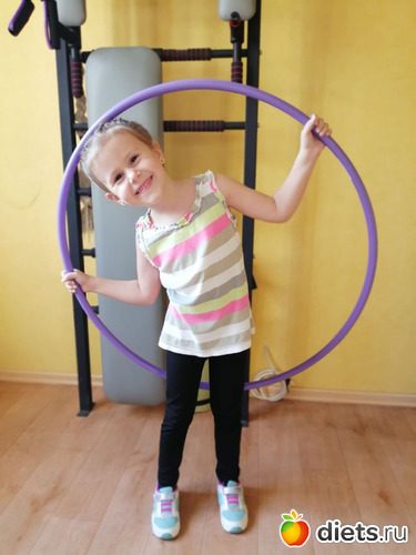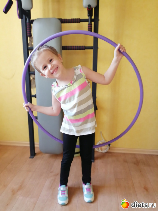 Это же упражнение можно разнообразить, предложив ребенку удерживать в руках гимнастический обруч небольшого диаметра.