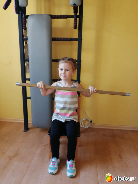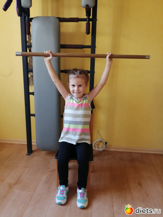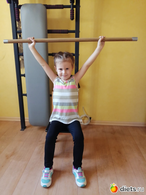 Как следует из названия, для выполнения упражнения понадобится гимнастическая палка. Пусть ребенок поднимет ее прямыми руками над головой. Затем следует согнуть руки в локтях и опустить палку к груди. Повторите упражнение 3-6 раз.