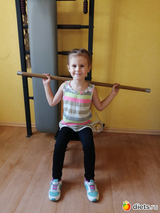 Упражнение похоже на предыдущее. Только теперь гимнастическую палку следует расположить за спиной и удерживать ее согнутыми в локтях руках. Далее пусть ребенок выпрямляет руки в локтях и поднимает снаряд над головой. Повторите упражнение 3-6 раз.