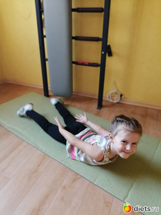 Далее пусть малыш перевернется на живот и прямые руки отведет за спину. Затем ему предстоит поднять над полом голову и грудную клетку. Пусть повторит упражнение 6 раз.