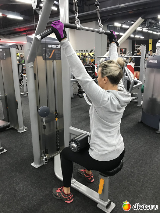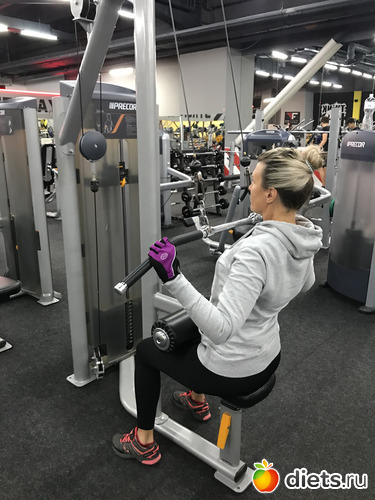 1. Тяга к плечам. Выполняется сидя в специальном тренажере. Поднимите руки вверх и ухватитесь за ручки тренажера. Затем согните руки в локтях и потяните ручки тренажера вниз к плечам.