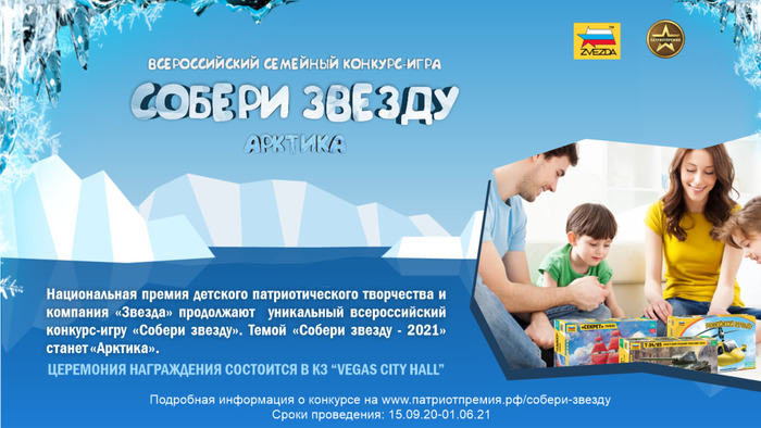 Национальная премия детского патриотического творчества и компания «Звезда» продолжают всероссийский семейный конкурс-игру по моделизму «Собери звезду». Темой «Собери звезду - 2021» станет «Арктика». «