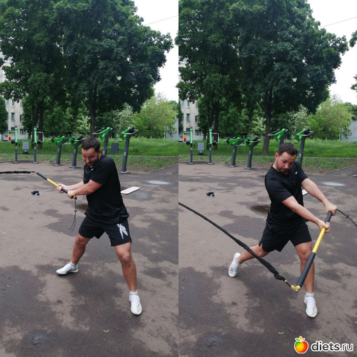 Рукоять со стороны крепления держим нижним хватом, с другого конца – верхним. Новички удерживают рукоять на уровне бедер горизонтально полу, профессионалы, – направив конец рукояти со стороны троса в пол. Преодолевая сопротивление троса, разворачивайте корпус от крепления.