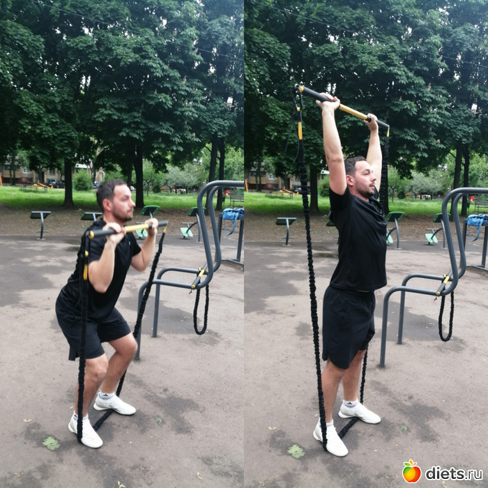 Далее зафиксируйте центр троса под стопами, рукоять удерживайте перед собой обеими руками, согнутыми в локтях. Присядьте не слишком глубоко, затем выпрямитесь и одновременно выпрямите руки вдоль головы и выжмите рукоять тренажера наверх, преодолевая сопротивление троса.