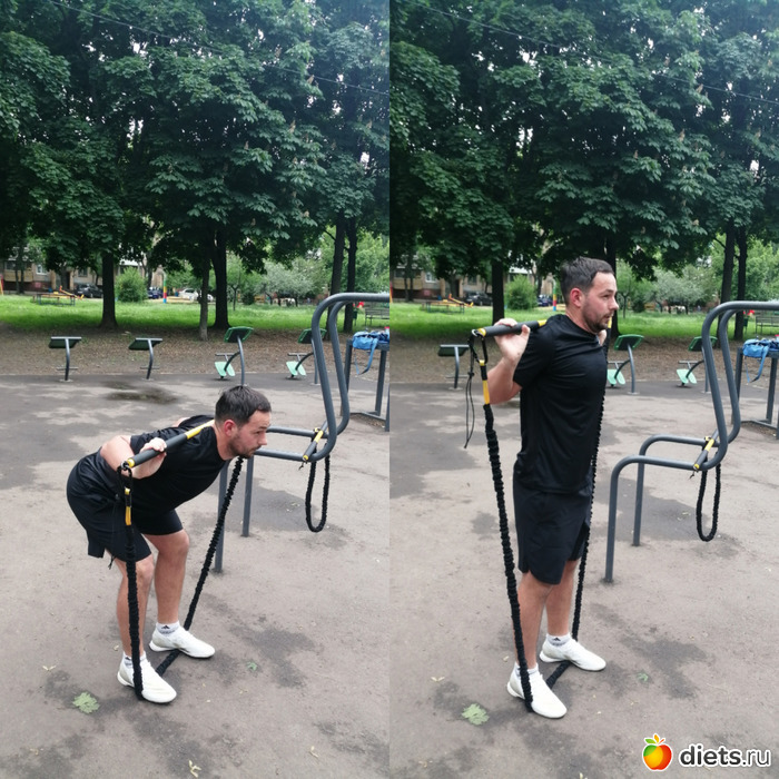 А ту же становую тягу можно выполнять с помощью TRX Rip, расположив рукоять на плечах.