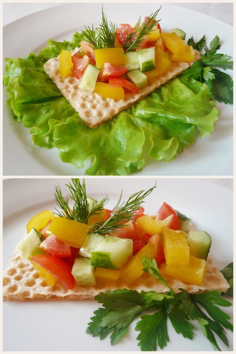 Томаты, огурцы и болгарский перец нарезаем кубиками. Заправляем салат оливковым маслом, солим и перчим по вкусу. Перемешиваем и выкладываем на пластину вафельного хлеба. Украшаем зеленью. Можно подавать на блюде на листьях зеленого салата.