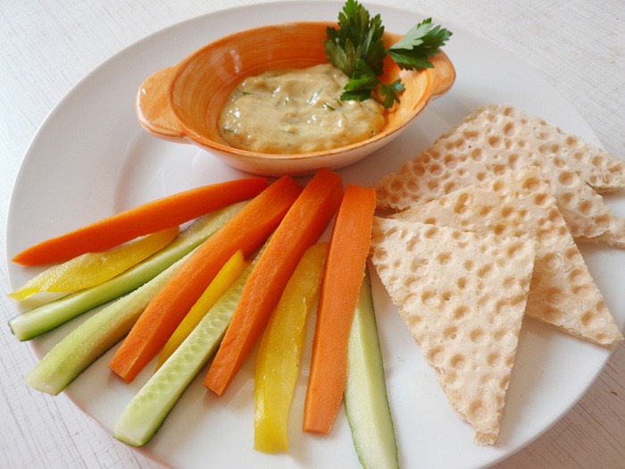 Болгарский перец, морковь и огурец режем вдоль на тонкие полоски. Вафельный хлеб режем на треугольники. Все выкладываем на большое блюдо. Есть хлебцы с овощами, обмакивая их в соус.