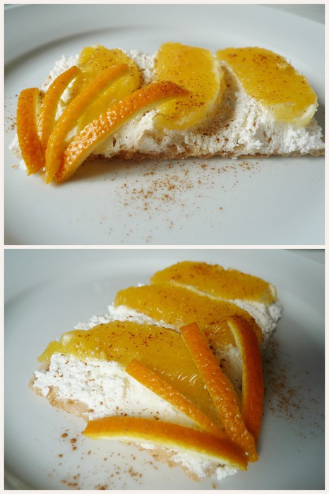На пластину вафельного хлеба выкладываем нежирный творог. Апельсин чистим от кожицы и режем на дольки. Выкладываем на творог. Посыпаем десерт корицей, но при желании корицу можно заменить на кофе или тертый шоколад. Блюдо украшаем полосками апельсиновой цедры.