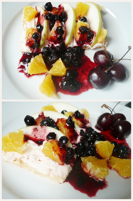 На пластины вафельного хлеба намазываем сладкую творожную массу. У меня она с брусникой, но вы можете заменить на массу с вишней, абрикосом и даже изюмом. Апельсин чистим от кожицы и режем на кубики. Яблоки режем длинными пластинами. Выкладываем фрукты на хлеб. Свежую чернику перетираем с сахаром (по желанию) и готовым вареньем поливаем наш десерт. Для украшения на блюдо кладем несколько ягод черешни (или вишни).