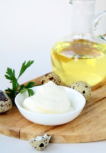 Потребуется пол-литра оливкового масла, четыре желтка, две чайные ложки горчицы, одна чайная ложка сахарного песка, две чайные ложки соли и черный перец. Сначала следует отделить желток от белка, затем взбить желтки с горчицей, добавить перец и соль. Затем по капле добавить оливковое масло (все время помешивая). Когда выльете 150 мл масла, можно лить его струйкой. Вымешиваем до тех пор, пока не выльется все масло, а масса не станет однородной. Тогда надо добавить две столовые ложки 3% винного уксуса и перемешать. Масса должна побелеть. Такой майонез можно хранить в холодильнике трое суток.