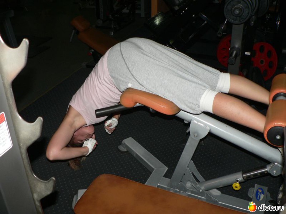 После разминки переходим к гиперэкстензии. Бедра на лапах тренажера, ноги на специальных педалях. Руки согнуты в локтях на уровне головы. Плавно, на выдохе выполняем прогиб спины назад, затем наклоняемся перед, но не роняем корпус к полу. 15-20 повторений в одном подходе. В данном случае одновременно работают спина, грудная клетка, поясница и пресс.
