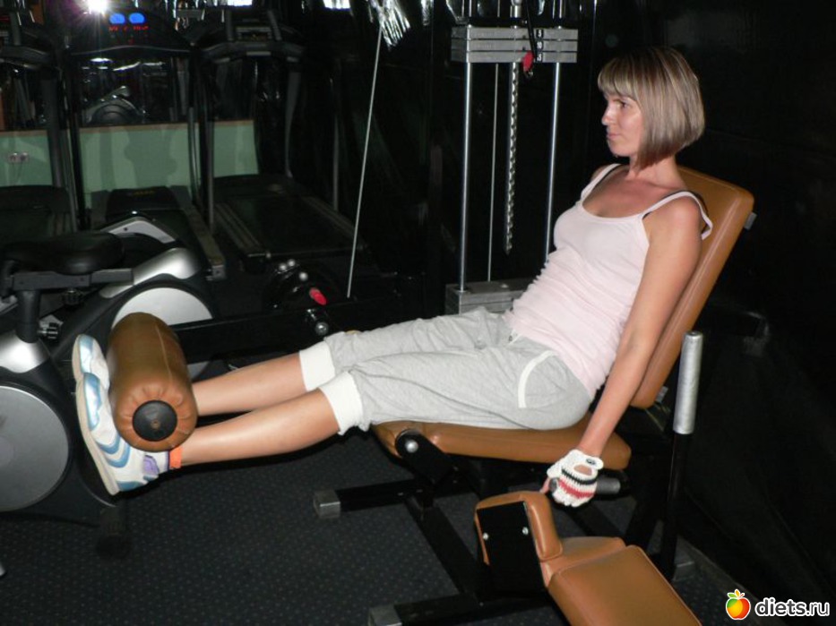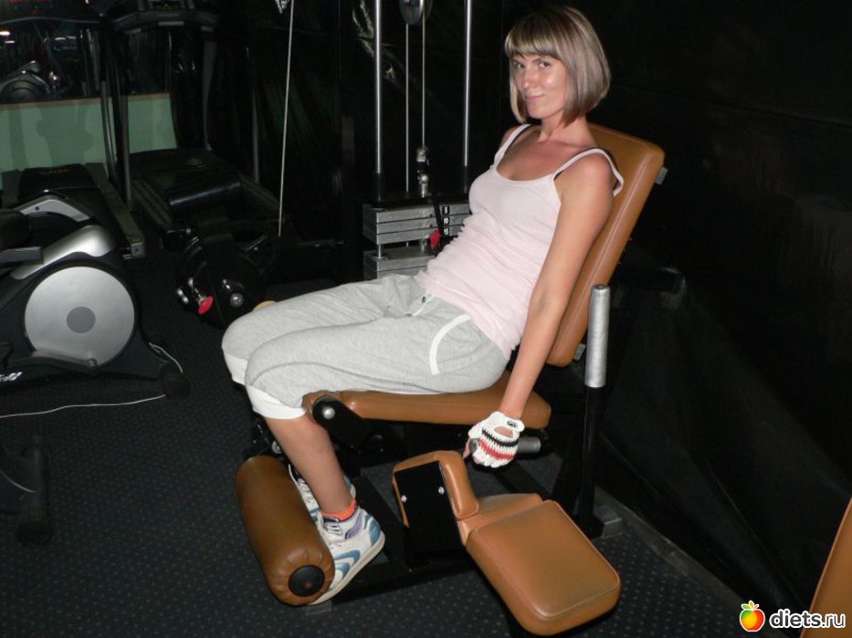 Теперь выполняем 20 подъемов ног сидя. Следите, чтобы носок был направлен на себя. Не забывайте выполнять упражнение плавно, не бросайте ноги внизу, хлопка грузов не должно происходить.
