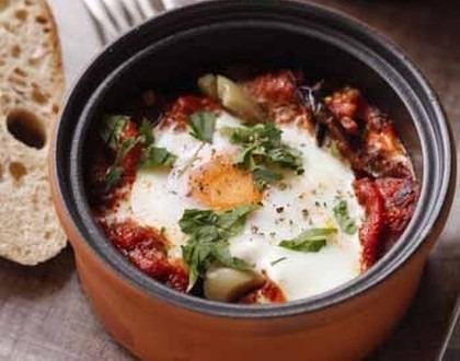 Два баклажана нарежьте небольшими кусочками и обжарьте. Луковицу мелко нарежьте и добавьте к баклажанам, посолите, поперчите и добавьте чайную ложку тмина. Все это жарьте десять минут. Нарежьте пластинками шампиньоны и обжарьте их. Затем взбейте восемь яиц, пятьдесят миллилитров молока, добавьте сто граммов сыра и перемешайте, поперчите и посолите. В форму выложите баклажаны с луком, потом вылейте яйца, положите грибы и два помидора, нарезанных дольками. Запекайте фриттату двадцать минут. Это блюдо содержит всего 102 калории.