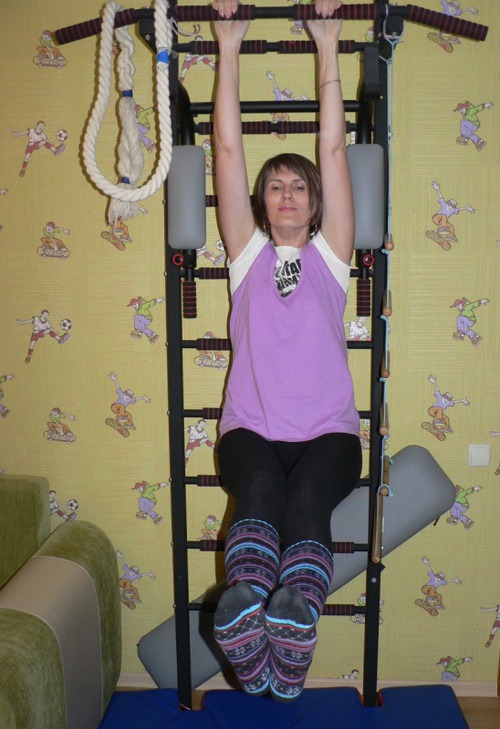 Начинать тренировку брюшных мышц следует с упражнений для нижнего пресса. Для этого повисните на перекладине прямым хватом. Руки расположите на ширине плеч, лопатки сведите. Из этого положения сначала поднимите согнутые в коленях ноги, задержите их в верней точке на три счета, затем медленно опустите вниз и выпрямите. Постепенно усложняйте упражнение, выполняя его с уже прямыми ногами, не согнутыми в коленях. Количество подъемов – не менее 10. Спина должна оставаться прямой, прижатой к стене.