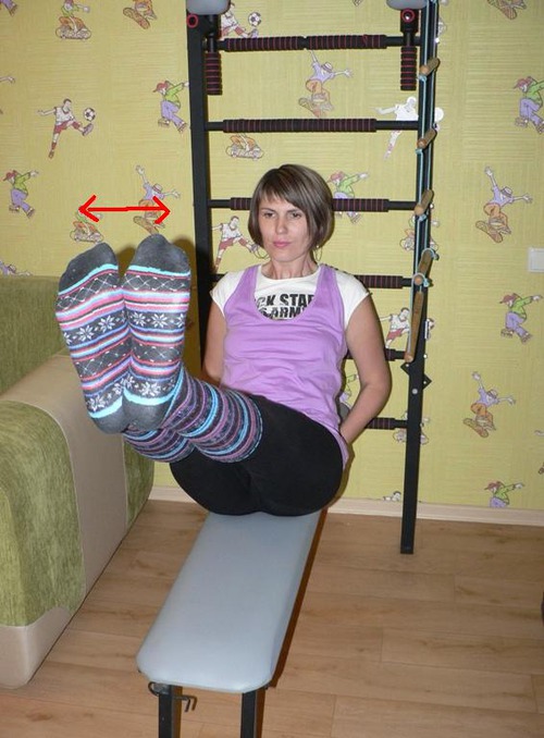 Далее переместитесь на гимнастическую скамью. Сядьте на нее и немного отклонитесь назад. Обеспечьте себе опору, взявшись за скамью руками немного позади себя. Из этого положения поднимите прямые ноги вверх и снова зафиксируйте позу на три счета. Чтобы легче было держать «уголок», заполните это время сведением и разведением стоп. Затем плавно опустите ноги вниз. Повторите не менее 10 раз.