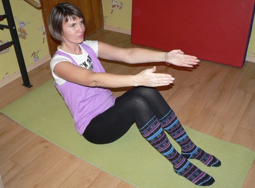Следующим этапом будет полный подъем туловища. Для лучшего баланса прямые руки держите перед собой.