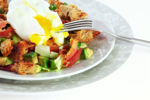 Необходимо обжарить 100 г порезанного бекона. Затем надо нарезать один крупный авокадо. Разложить авокадо на листья зеленого салата. Соединить двадцать граммов сливочного масла, три столовых ложки томатной пасты, одну столовую ложку соевого соуса, одну столовую ложку винного уксуса и три столовых ложки сахара нагреть в микроволновке две минуты. Затем посыпать на авокадо бекон и побрызгать приготовленным соусом. Такой пикантный салатик содержит 220 ккал.