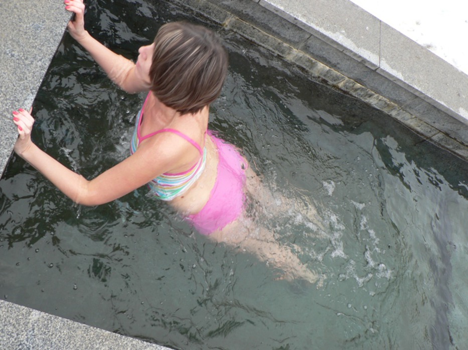 - Теперь быстро снимите мокрый купальный костюм (лучше это делать под халатом), промокните кожу с помощью полотенца (растирания не нужны!) и переоденьтесь в сухое нижнее белье и остальную одежду и обувь.