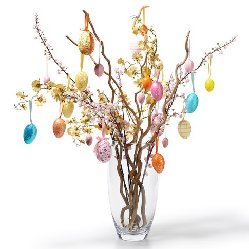 «Пасхальное дерево». Для создания этой композиции понадобится сухая объемная ветвь любого дерева. Веточка подходящего размера устанавливается в вазу и наряжается по типу новогодней ёлки. Но в этот раз используются не новогодние игрушки, а крашенки разных цветов из пластика, птички из ткани, декоративные бабочки, ленточки. Вместо обычных голых ветвей можно использовать веточки вербы.