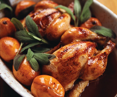 Приготовление: цыпленка разделить на куски, вымыть, высушить бумажным полотенцем, смазать сливочным маслом, натереть солью, оставить на 2-3 часа. Затем выложить в форму для запекания, обложить мушмулой без косточек, разрезанной на 2-4 части, выпекать при температуре 180 градусов 45-50 минут. Затем вынуть 2-3 штуки мушмулы и при помощи блендера превратить в пюре. Пюре смешать с яблочным и лимонным соком, этим составом смазать кусочки курицы и поставить в духовку на 15 минут.