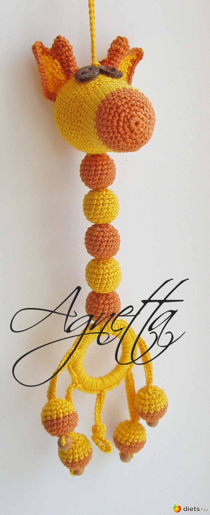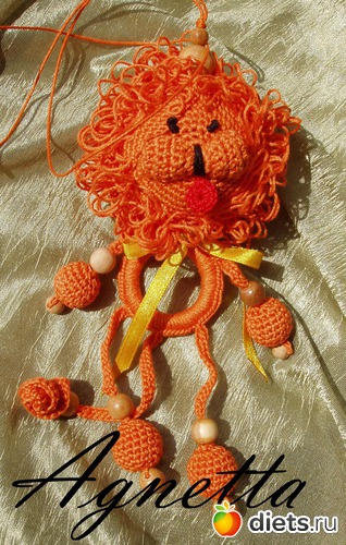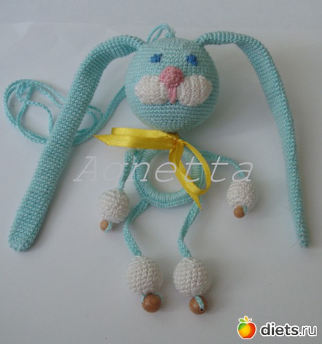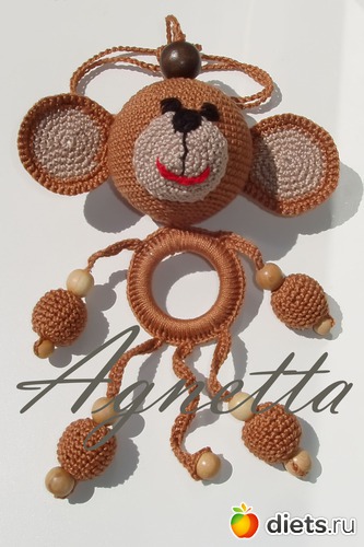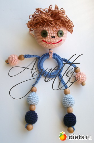 мерсеризованный хлопок, можжевеловые бусины, качественный пластик (погремушка, колечко, пуговицы), атласная лента