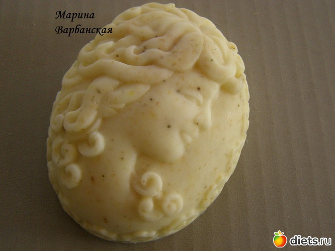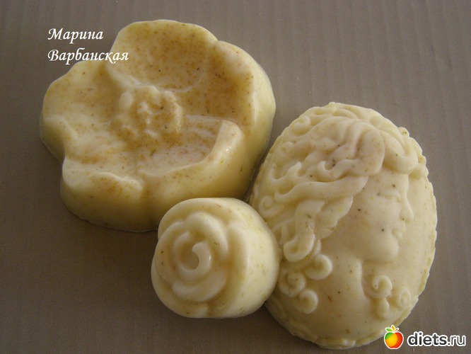 Мыло с ромашкой Мыло из матовой мыльной основы с добавлением масел: макадамии, календулы, касторового, крема и измельченных цветков ромашки. Вес 90-100 гр.