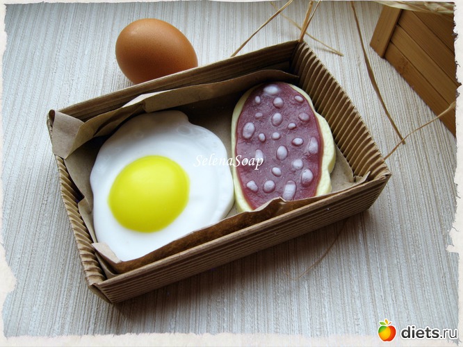 Набор мыла "1 апреля, завтрак" я придумала и сделала для людей с неординарным мышлением и чувством юмора)) Для тех кто любит пошутить и не боится быть смешным сам) В набор входит бутерброд с колбасой и яичница-глазунья.