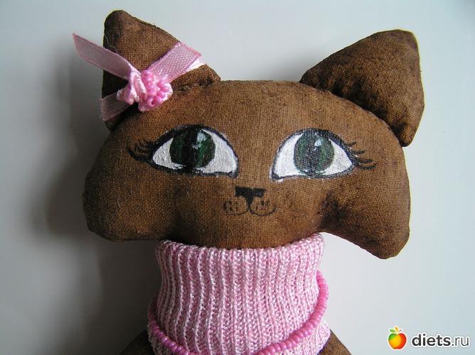 Кошечка Хаврошечка Кошечка 30см.Сшита из бязи,тонирована и ароматизирована кофе,корицей и ванилином.Одежда из шелка и трикотажа,съемная.Аксессуары из бисера,атласных лент,мордочка расписана акриловыми красками для ткани.