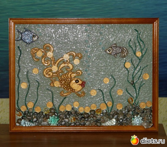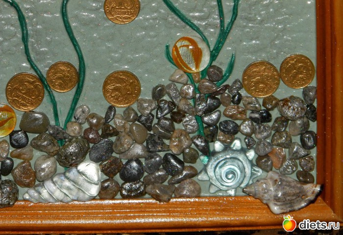 Картина сделана на стекле с применением натуральных камней, ракушек, акриловых капель и медных монет. Размер 30*40 см.