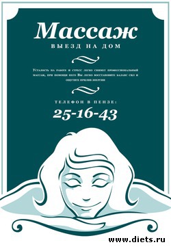 Массаж  у Вас дома Массажист приезжает к вам домой со своей кушеткой, маслом и прочими массажерами. Общий, расслабляющий, антицеллюлитный, баночный, медовый, массаж головы и лица, противоотечный. Прейскурант (за 1 сеанс): общий -- 600 р спина -- 300 р воротниковая зона -- 200 р руки и лопаточная зона -- 200 р ноги и ягодицы -- 200 р антицеллюлитный -- 300 р за зону (зоны: живот, бедра, ягодицы) Массажист выезжает к ВАМ на дом в удобное время, для вашего удобства и качества процедур есть переносная кушетка, массажеры, арома-масла и массажные масла. Несколько клиентов по одному адресу - скидка 10%