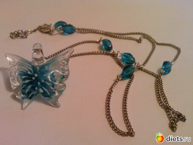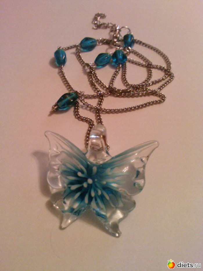 кулон на цепочке "Океаническая бабочка" кулон из стекла с объёмным рисунком внутри в виде бабочки на цепочке. цепочка с 6 бусинами из чешского стекла изумрудно-голубого цвета. длина цепочки 61 сантиметр + 5 сантиметров на удлинение, по желанию длину цепочки могу нарастить. часть средств от продажи кулона поступит на счёт благотворительной организации.