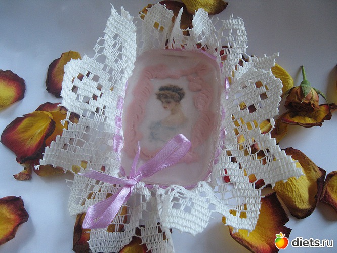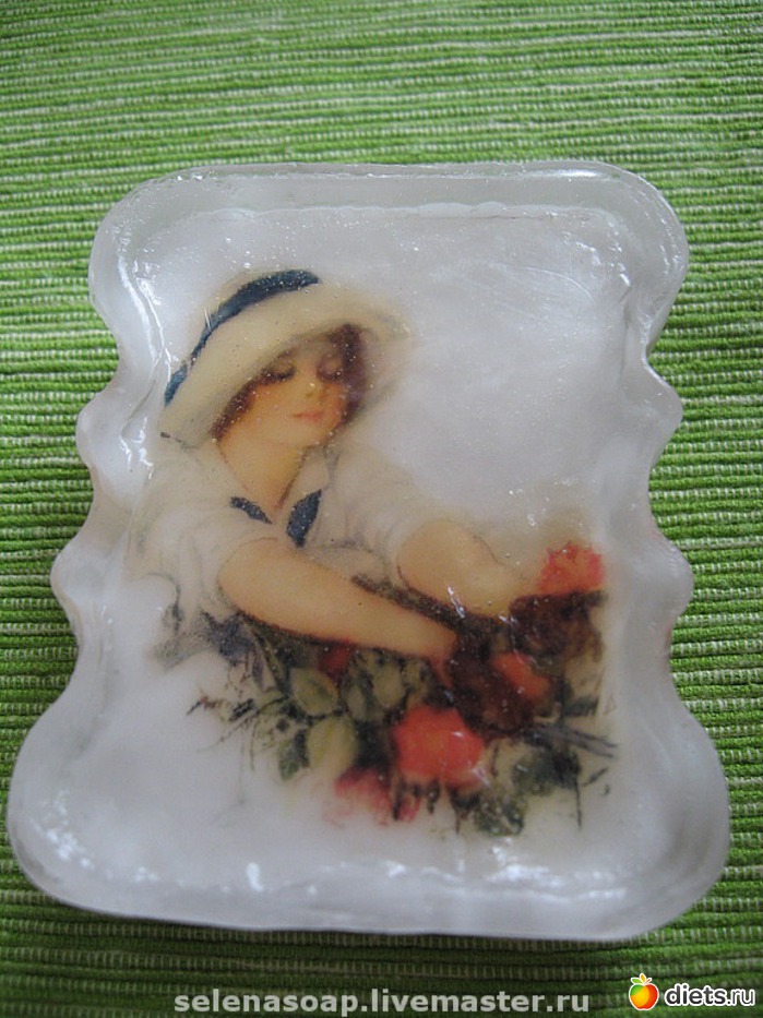 Мыло в технике декупаж "Девушки Фишера" Серия "Девушки Фишера" была создана мной для утонченных, элегантных дам, которые ценят в простых, казалось бы вещах, их эстетическую сторону. Мыло с портретами прекрасных девушек, обсыпанных звездами блесток, как будто спрятаны от нас под стеклом, создавая ощущение недоступности. Пикантный аромат эфирных масел корицы и лаванды сопровождает эти прекрасные портреты и сохраняется в мыле долгое время. Сделать такой подарок-почти как подарить украшение. Только хозяйке такого подарка выбирать, использовать его по назначению или подобрать к нему раму.