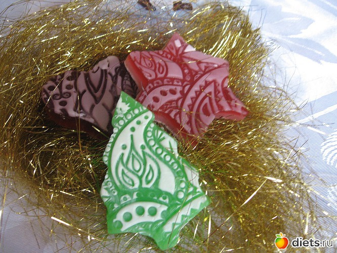 Мыльный набор "Елочные игрушки" Набор из трех мыльных "елочных игрушек" с праздничным орнаментом и замечательным ароматом. Сумочка авторская в подарок! Мыло не только красивое, но и полезное. В составе вит.А и Е экстракт зеленого чая.
