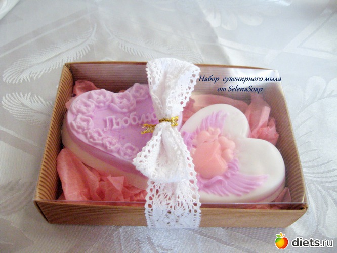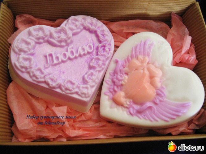 Набор мыла "Валентинки" Две валентинки упакованы в одну коробочку как два влюбленных сердца навсегда вместе. Нежные тона, в которых выполнено мыло подойдет любой, кто верит что от любви вырастают крылья! Состав: основа мыльная (Англия SLS Free), пищевые красители, парфюмерная композиция.