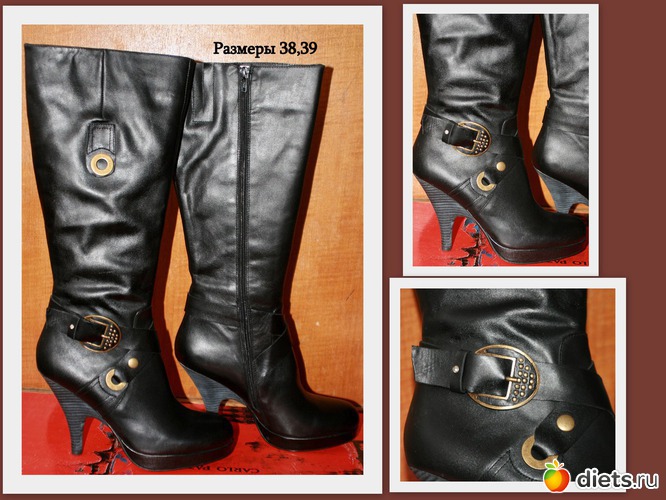 Сапоги женские, цвет черный, сбоку украшены пряжкой, имеется одна страза на каждом сапожке. Каблук не очень большой, нос округлый. Подойдет на осень-весну, в наличии так же есть дополнительные набойки, совершенно новые сапожки, это видно по подошве и каблуку. Имеется 38 и 39 размер, если надо могу измерить размер в см по стельке. Стоимость: 400 рублей. Возможна отправка по почте, оплачивается покупателем