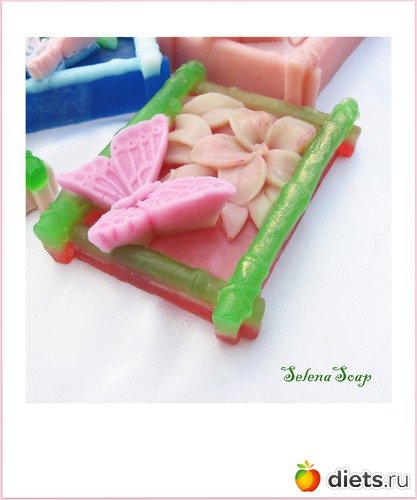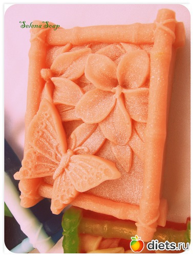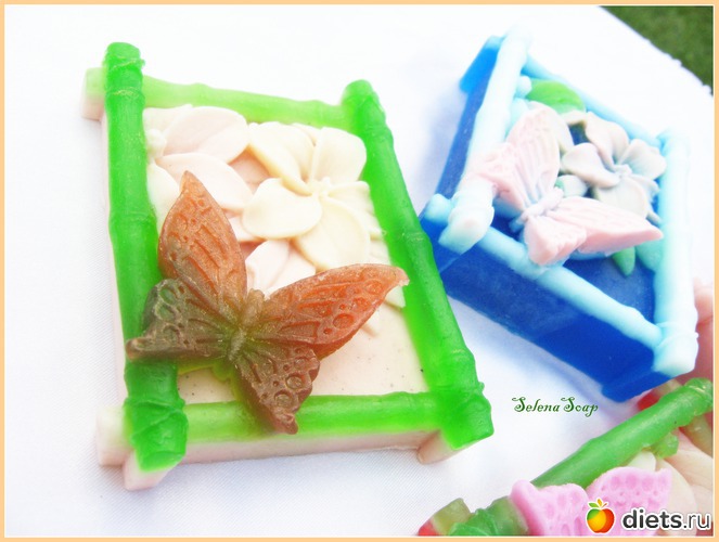 Мыло "Райский сад" Удивительный райский сад с ажурными бабочками и тропическими цветами в рамке из бамбука на одном кусочке мыла! Ароматы дыни, груши и иланг-иланг сопровождают это красивое мыло. Большой выбор цветовых сочетаний на любой вкус. Состав: Основа мыльная (Россия), красители, пигменты, парфюмерные композиции. Вес: 100-130 гр