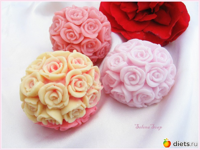 Мыло "РОЗовый букет" Вам мало одной розы - у меня есть для Вас целый букет роз! Его очень удобно держать в ладошке и вдыхать аромат эфирных масел. Очень нежная текстура мыла сделает уход за кожей настоящим праздником. Состав: Основа мыльная (Россия), эфирные масла, красители и пигменты. Вес: 60-70 гр